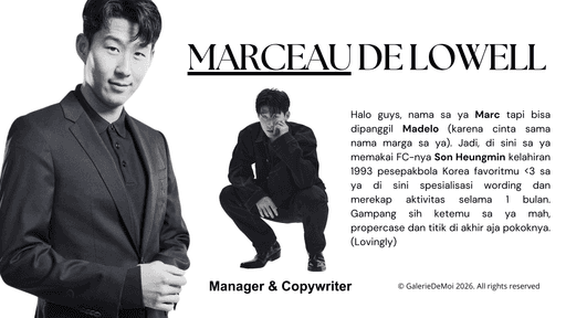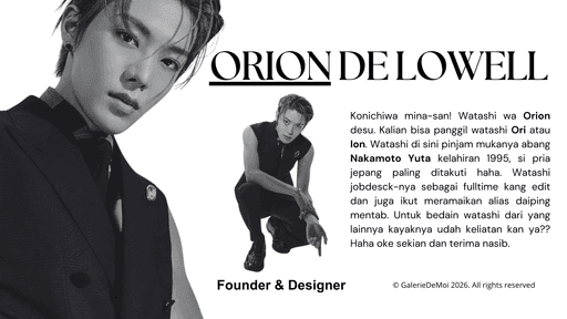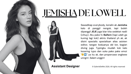 "Galerie de moi," yang berarti Gallery of Me, adalah proyek fiksi untuk agensi terbuka dengan aktivitas ringan yang hadir sebagai museum couture hidup bernuansa soft luxury.